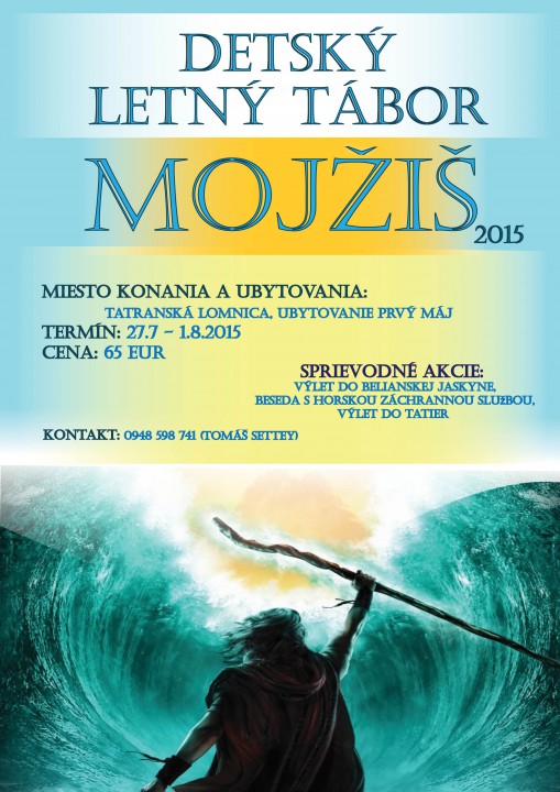 Základné informácie o tábore: Termín: 27.07.2015 – 01.08.2015 (pondelok – sobota) Miesto konania: Tatranská Lomnica – Ubytovanie Prvý máj Vekové rozmedzie účastníkov: 6 – 12 rokov Výška účastníckeho poplatku: 65 € (zahŕňa všetky poplatky spojené s táborom, tj. ubytovanie, stravovanie 5x denne, dopravu, vstupné, materiálne náklady, poistenie atď.) Hlavná téma: Mojžiš