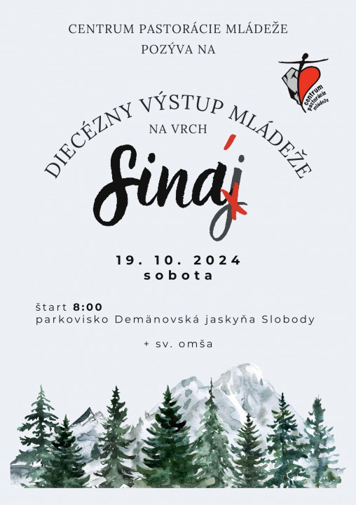 Centrum pastorácie mládeže pozýva na sobotu 19.októbra na Diecézny výstup na vrch Sinaj (v skutočnosti na vrch Siná). Štart je o 8:00 z parkoviska Demänovskej jaskyne Slobody. Súčasťou výstupu je aj svätá omša.