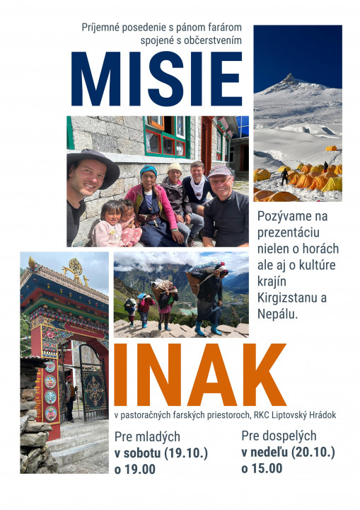 Aj v našej farnosti máme možnosť prežiť Misie inak. Pán farár nám na stretnutiach v sobotu 19.10. o 19:00 predovšetkým pre mladých a v nedeľu 20.10. o 15:00 predovšetkým pre dospelých priblíži nielen hory ale aj kultúru krajín Kirgizstanu a Nepálu. Spolu s ním máme možnosť zúčastniť sa príjemného posedenia s občerstvením vo farských pastoračných priestoroch.