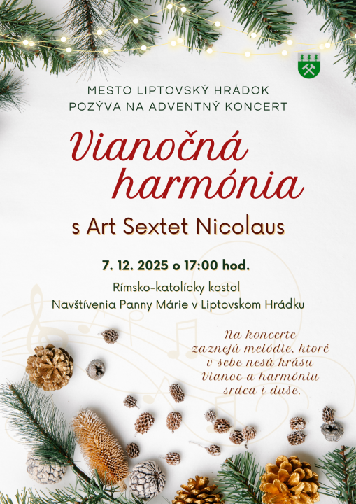 Mesto Liptovský Hrádok pozýva na nedeľu 7.12.2025 na Adventný koncert Vianočná harmónia s Art Sextes Nicolaus. Koncert sa bude konať v našom kostole o 17:00. Na koncerte zaznejú melódie, ktoré v sebe nesú krásu Vianoc a harmóniu srdca i duše.