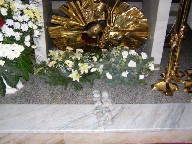 Hriech je niečo, čo nás vzďaľuje od Boha. Hriech ťaží naše svedomie a zahmlieva pravdivý obraz života. Keď sa úprimne a kajúcne vyspovedáme, stávame sa nielen lepšími, ale akoby nám spadol kameň zo srdca a približujeme sa rýchlejšie k nebu. Tento symbol sme si však vybrali aj pre to, lebo krížová cesta po ktorej kráčal Ježiš bola z kameňov. Kamene hádzali aj do Krista, keď kráčal krížovou cestou s ťažkým krížom...naše hriechy sú tiež takými kameňmi, na ktorých sa lesknú kvapky krvi Ježiša Krista....