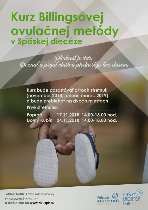 Pozývame vás na kurz Billingsovej ovulačnej metódy. Kurz je určený pre manželov, snúbencov a slobodných, ktorí chcú spoznať a pochopiť krásu Božieho plánu s vlastnou plodnosťou a hlbšie vniknúť do podstaty Prirodzených metód plánovania rodičovstva a učenia Cirkvi.