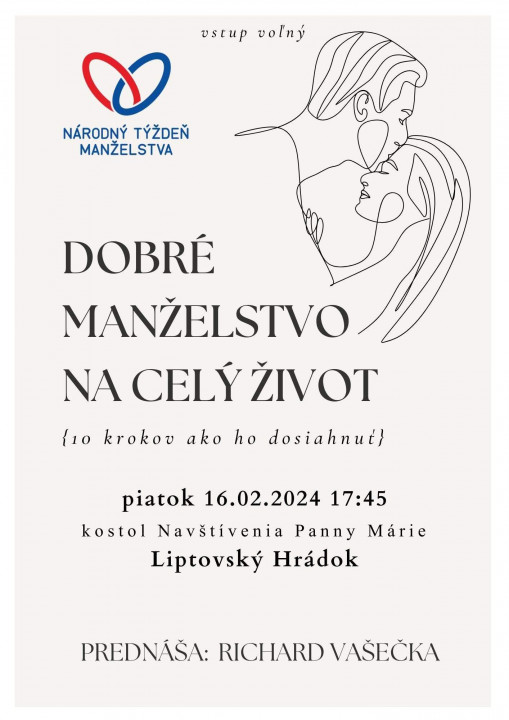 Projekt "Milovať a ctiť" v rámci Národného týždňa manželstva pozýva na prednášku Richarda Vašečku na tému: "Dobré manželstvo na celý život - 10 krokov ako ho dosiahnuť", ktorá sa uskutoční v našom kostole tento piatok 16.2.2024 o 17:45. Vstup je voľný.