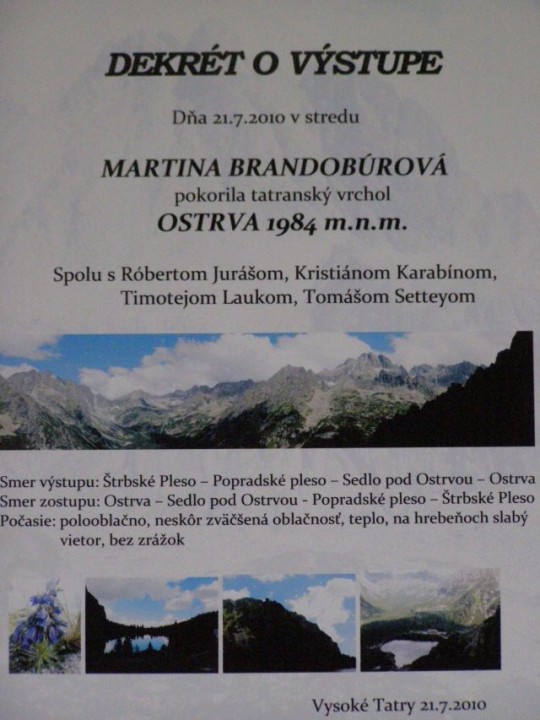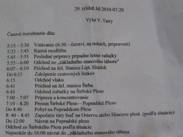 Výlet Vysoké Tatry, výstup na vrchol Ostrva 1984 m.n.m. Vstávanie bolo veľmi ťažké, ale zvládli sme to a vyrazili sme podľa časového rozvrhu, ktorý pripravil náš horský sprievodca Tomáš. Po spoločnej modlitbe nás p. farár odprevadil na vlakovú stanicu. Tešili sme sa, že pôjde s nami, ale kňazské povinnosti mu v tom zabránili. Počasie bolo nádherné a tak sme si mohli užívať krásu našich veľhôr. Zo Štrbského plesa sme spoločne prešli na Popradské pleso, odkiaľ na výstup na vrchol Ostrva pokračovala už len päťčlenná skupinka. Výstup sme zvládli a na vrchole sme mali z dosiahnutého úspechu úžasnú radosť. Po návrate na Popradské pleso, sme sa mohli s touto radosťou podeliť s tými, ktorí na nás trpezlivo čakali. Vrátili sme sa naspäť na Štrbské pleso, kde sme mali čas na prechádzku a oddych. Nevyhli sme sa ani stretnutiu s medveďom, no do základného tábora sme sa všetci vrátili živí a zdraví. Po svätej omši sme pokračovali spoločným zdieľaním pri ohníku, kde sme spolu s duchovným otcom rozoberali a lámali slovo z knihy Rút.